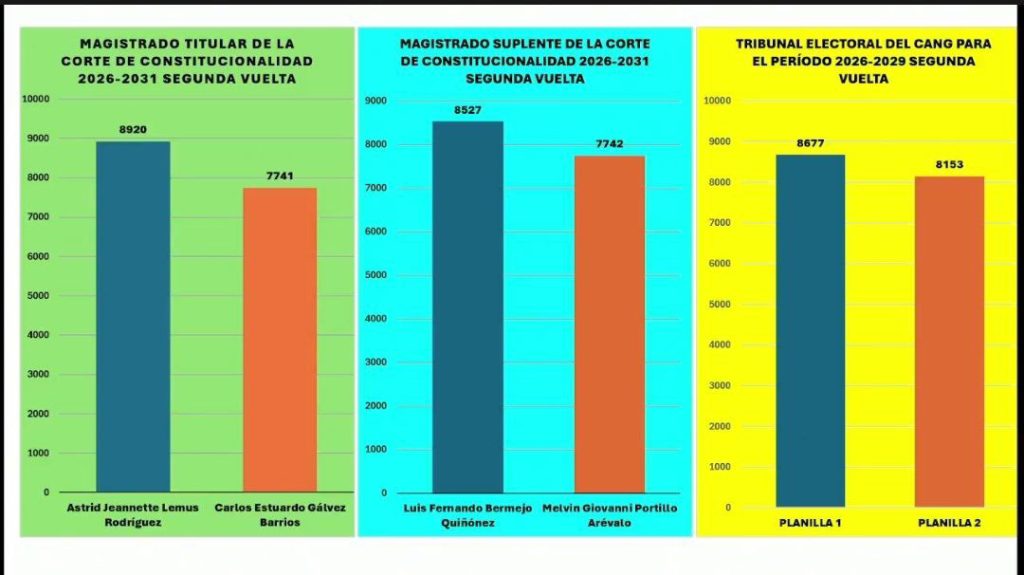 En este sentido, en un conteo inicialmente cerrado, Astrid Lemus resultó electa como magistrada titular y Luis Bermejo obtuvo el cargo suplente. Ambos participaron bajo el mismo movimiento en el concurso electoral. En el balotaje, aventajaron a Carlos Estuardo Gálvez y Melvin Portillo.