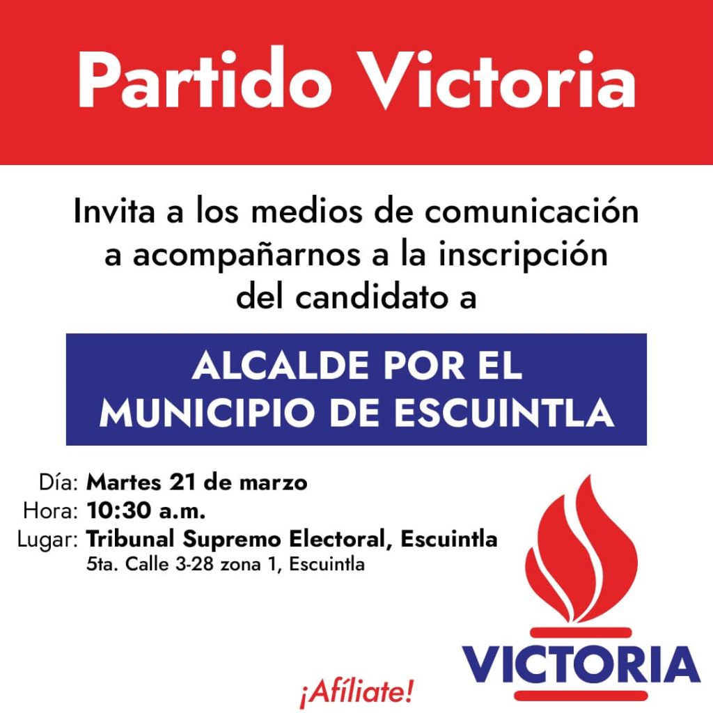 El Partido VICTORIA anunció esta mañana que este martes se inscribirá ante el Registro de Ciudadanos RC del Tribunal Supremo Electoral TSE como candidato a alcalde del municipio de Escuintla a Abraham Rivera