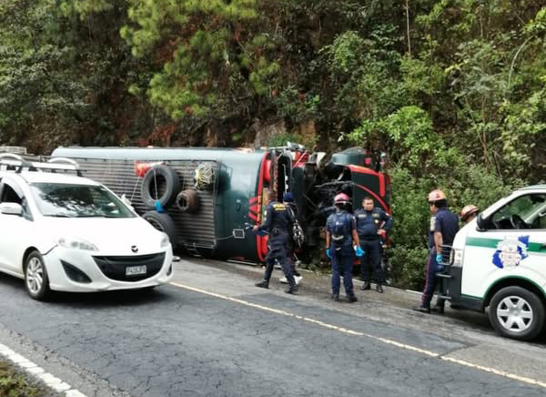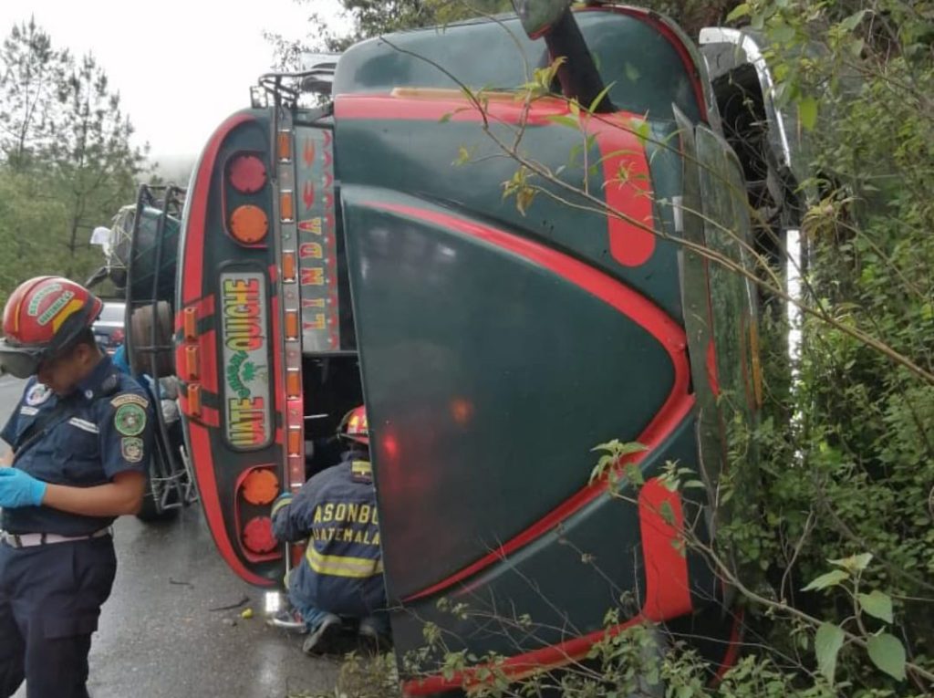 Un bus de transporte Extra-Urbano terminó volcado luego que, por causas que se ignoran, el conductor perdiera el control del vehículo en el kilómetro 140.5 de la ruta que comunica a Los Encuentros, Sololá con el municipio de Chichicastenango, departamento de Quiché, en el lugar conocido como «Las Vueltas del Tesoro».