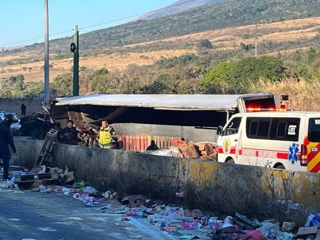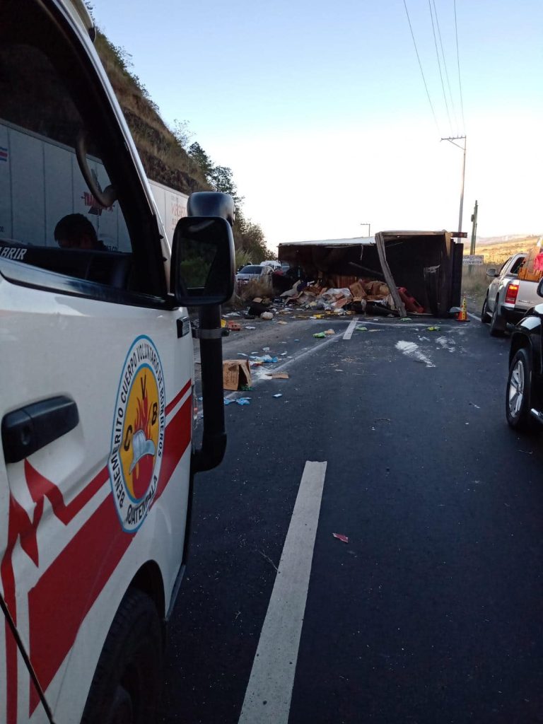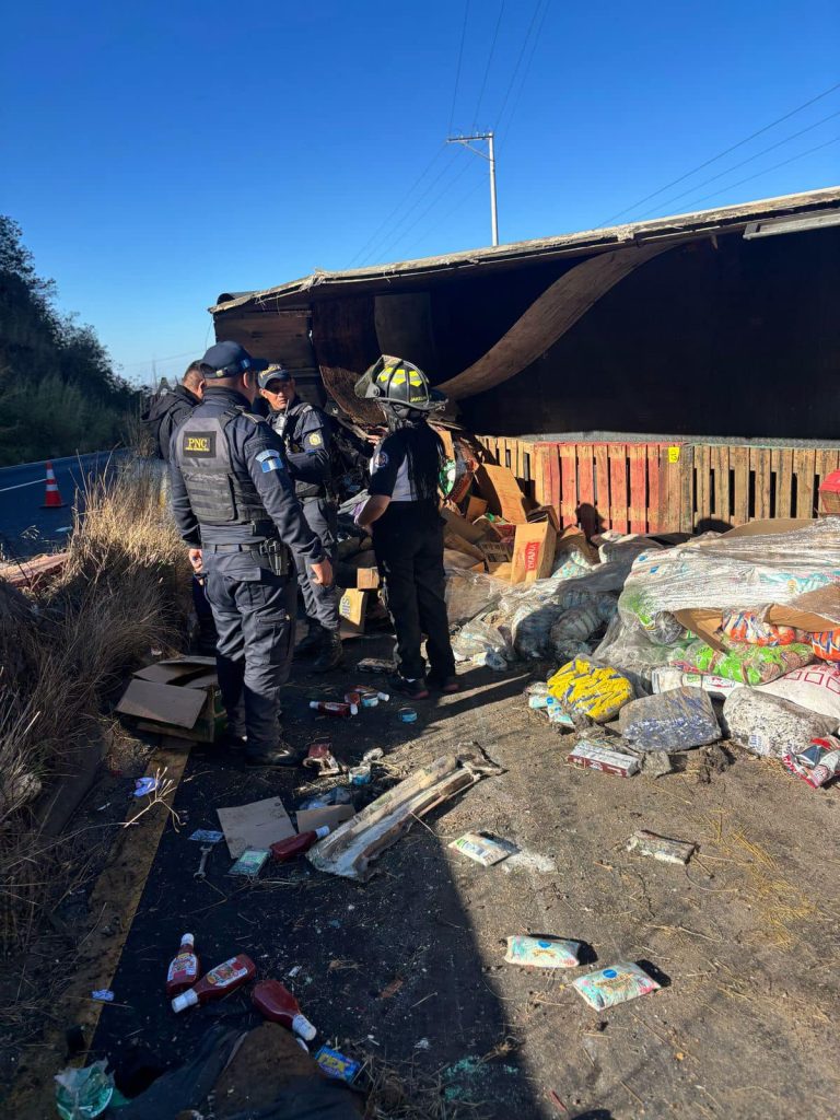 Camión queda volcado en la cinta asfáltica en el kilómetro 34 de la carretera hacia el Salvador, en la conocida curva de el chilero