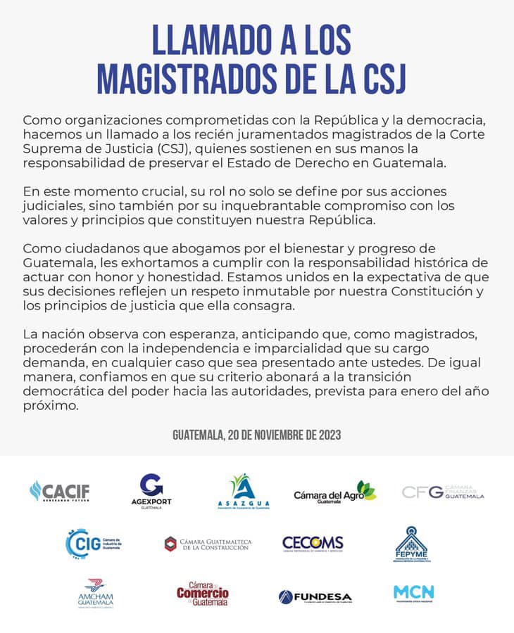 Este histórico comunicado de prensa está avalado por el Cacif, Cámara de Comercio, Cámara de la Construcción, Cámara de Industria de Guatemala, Azasgua, Cámara del Agro, Fundesa, Cámara Finanzas Guatemala , Fepme, Cecoms, Agexport, Amcham y MCN