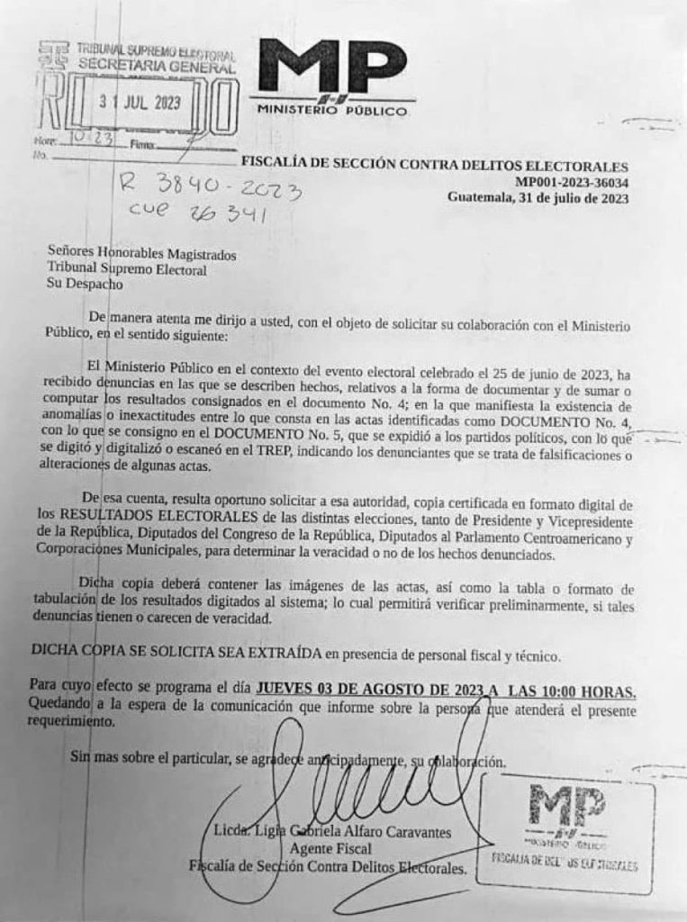 El Ministerio Público MP por medio de la fiscalía contra delitos electorales solicitó a los Magistrados del Tribunal Supremo Electoral TSE copia digitalizada de los resultados electorales del 25 de Junio para verificar la “veracidad” de una denuncia que está bajo investigación