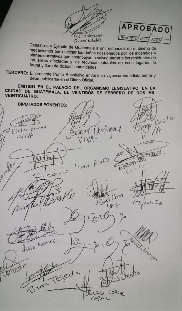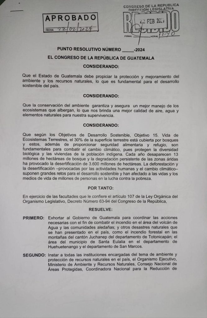 El Punto Resolutivo fue sobre la protección al área boscosa del Volcán de Agua, cuyo incendio forestal ha llevado a la evacuación de unas 200 familias.