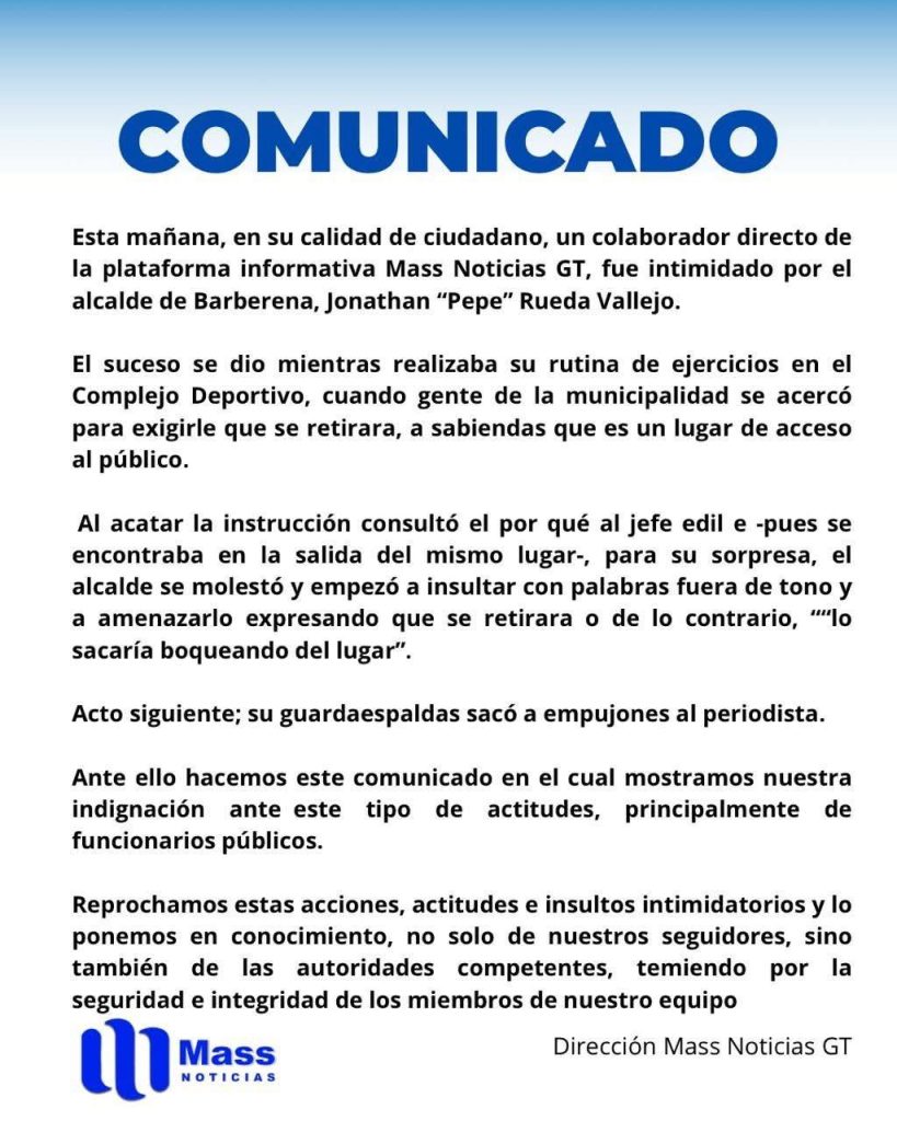 Denuncian intimidación del alcalde Municipal de Barberena Santa Rosa Jonathan “Pepe” Rueda Vallejo a colaborar de la plataforma digital Mass Noticias GT así lo dieron a conocer en un comunicado de prensa