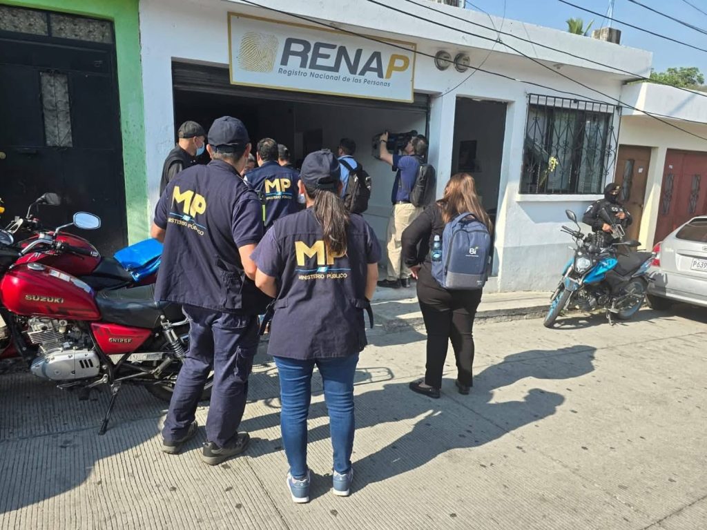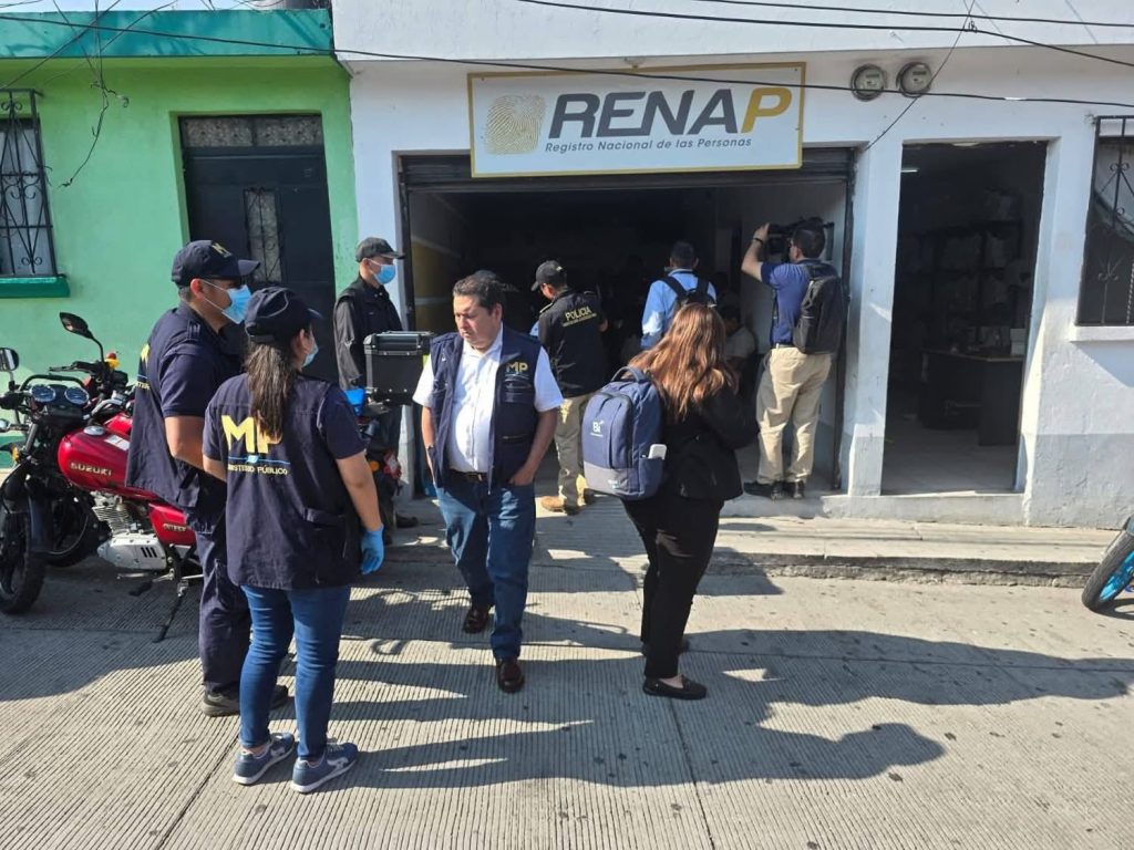 Investigadores de la Policía Nacional Civil PNC y fiscales Ministerio Público MP ingresan a la sede del RENAP en el municipio San José Del Golfo donde capturan a los trabajadores Yesenia Alejandra Mayen Ruano y Luis Rolando López Velásquez quienes se presume entregaron un documento de identidad DPI guatemalteco al ex funcionario mexicano Fernando Farías Lagunas detenido el pasado fin de semana en Argentina.