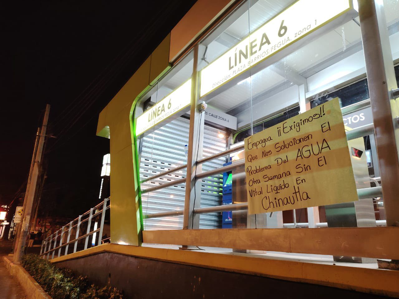 La desesperación por falta de agua potable lleva a los vecinos de Chinautla a instalar manuscritos dirigidos a la empresa municipal de aguas Empagua en las estaciones del Transmetro pidiendo que se solucione el problema