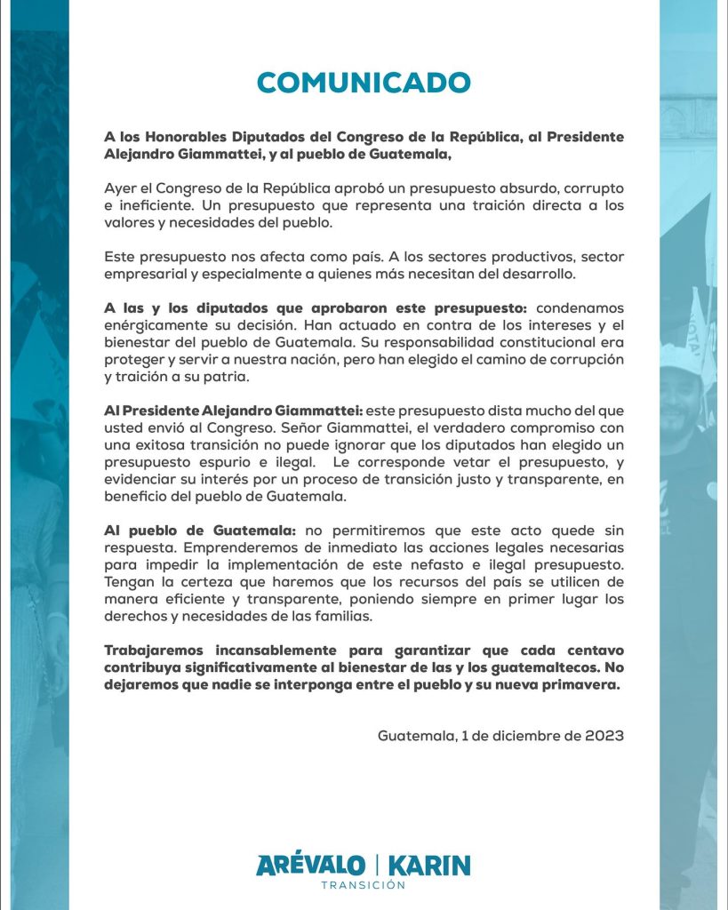 En un comunicado público dirigido a los diputados y al Presidente Alejandro Giammattei, Arévalo expresa que “Ayer el Congreso de la República aprobó un presupuesto absurdo, corrupto e ineficiente, un presupuesto que representa una traición directa a los valores y necesidades del pueblo”