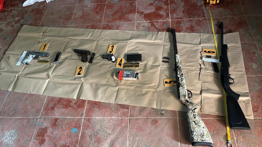 Hay 32 pistolas, 8 rifles, 8 fusiles, 2 escopetas y 1 arma tipo mini fusil. Estas armas de fuego estaban en los inmuebles, de forma ilegal, sin ninguna documentación, por lo que la investigación continua para dar con los responsables. Debido a que la población comenzó a aglomerarse para evitar la labor de los investigadores de la DEIC y el Ministerio Público MP, se optó por retirarse del lugar para continuar con el procedimiento y la investigación respectiva en otro lugar. Las armas se observan nuevas en sus cajas.