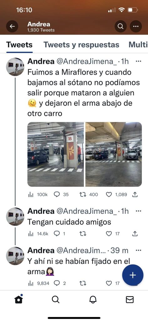 Personas que visitaron hoy Miraflores hicieron la denuncia pública del ataque “Fuimos a Miraflores y cuando bajamos al sótano no podíamos salir porque mataron a alguien y dejaron el arma abajo de otro carro” expresó en sus redes sociales Andrea Jiménez