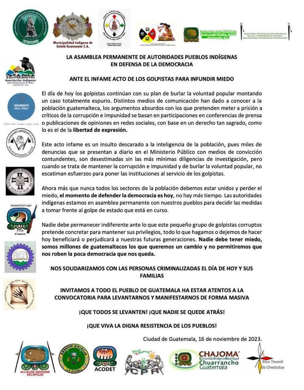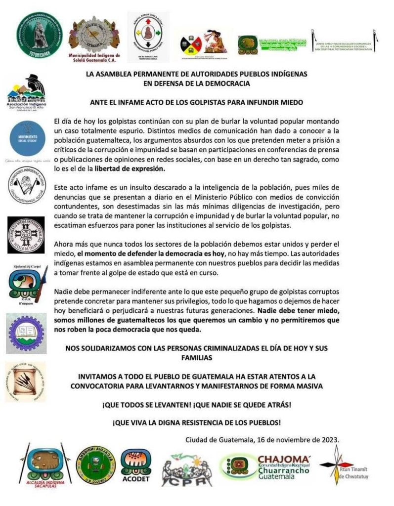 “Distintos medios de comunicación han dado a conocer a la población guatemalteca, los argumentos absurdos con los que pretenden meter a prisión a críticos de la corrupción e impunidad se basan en participaciones en conferencias de prensa o publicaciones de opiniones en redes sociales, con base en un derecho tan sagrado, como lo es el de la libertad de expresión” expresa los pueblos indígenas