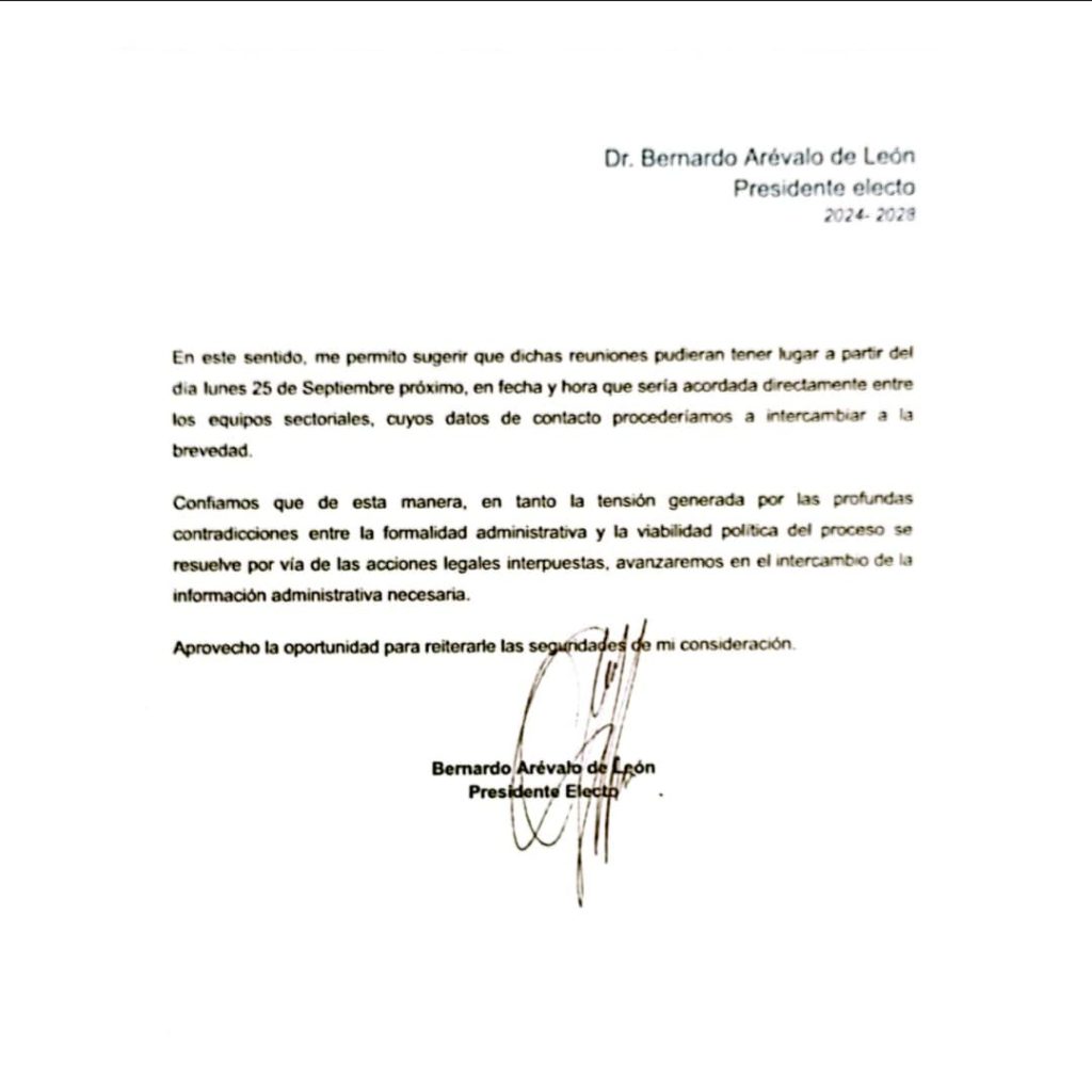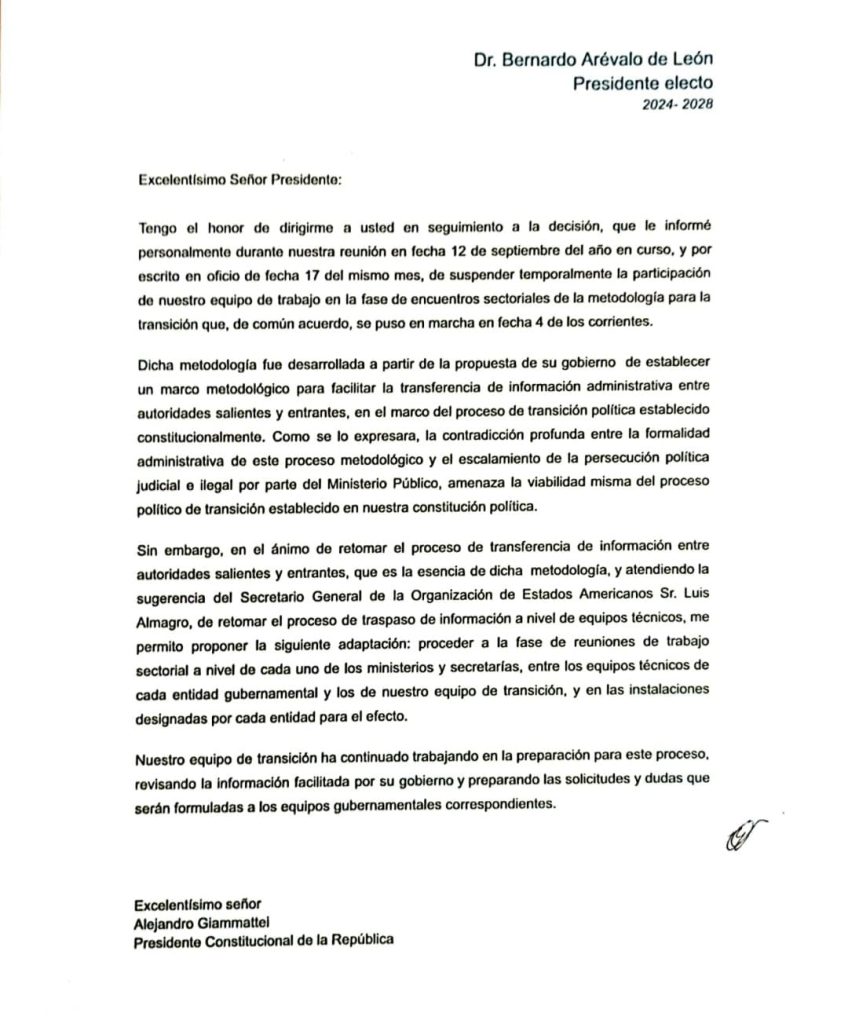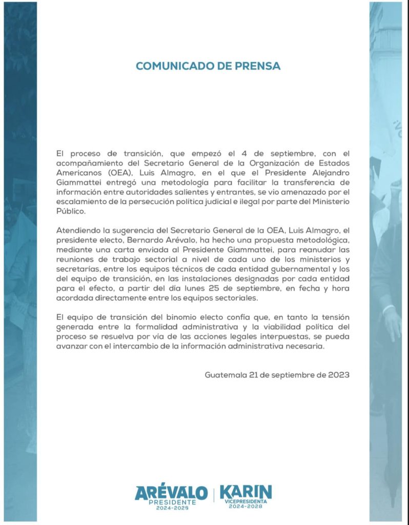 Agrega Arévalo que “ atendiendo la sugerencia del Secretario General de la OEA, Luis Almagro, el presidente electo, Bernardo Arévalo, ha hecho una propuesta metodológica, mediante una carta enviada al Presidente Giammattei, para reanudar las reuniones de trabajo sectorial a nivel de cada uno de los ministerios y secretarías, entre los equipos técnicos de cada entidad gubernamental y los del equipo de transición, en las instalaciones designadas por cada entidad para el efecto, a partir del día lunes 25 de septiembre, en fecha y hora acordada directamente entre los equipos sectoriales”