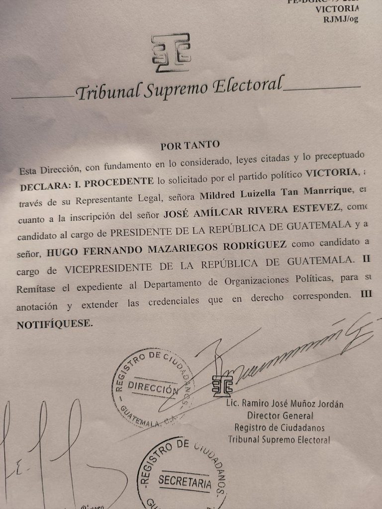 El Registro de Ciudadanos del Tribunal Supremo Electoral TSE declara con lugar este sábado la inscripción del Binomio Presidencial del Partido Victoria encabezado por Amílcar Rivera y Fernando Mazariegos