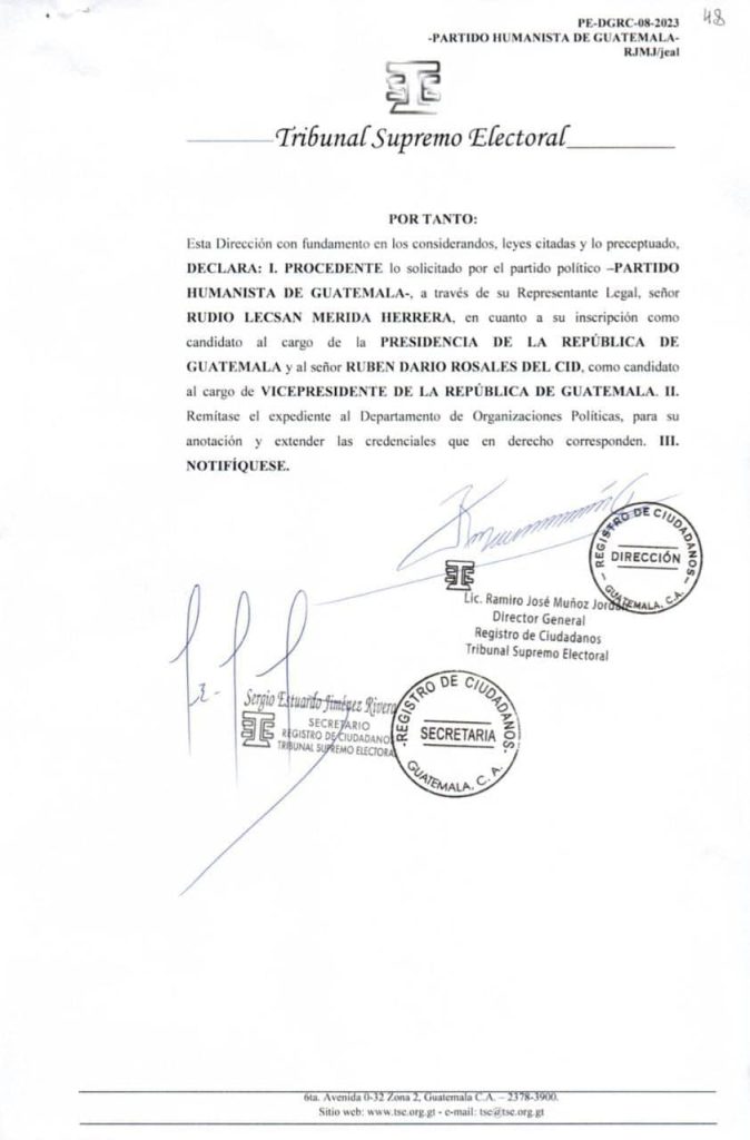 El Registro de Ciudadanos RC del Tribunal Supremo Electos TSE a notifica este domingo a Rudio Lecsan Merida y Darío Rosales que fueron inscritos como candidatos a la presidencia y vice presidencia respectivamente, por el Partido Humanista de Guatemala PHG