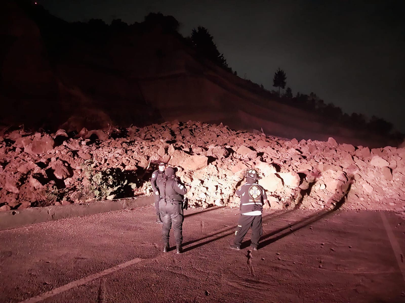 En kilómetro 60 libramiento de Chimaltenango se ha suscitado la noche de este Jueves Santo un derrumbe de grandes proporciones que tapa los cuatro carriles; Policía Nacional Civil Provial y Bomberos Voluntarios se encuentran en el lugar por tema de prevención.