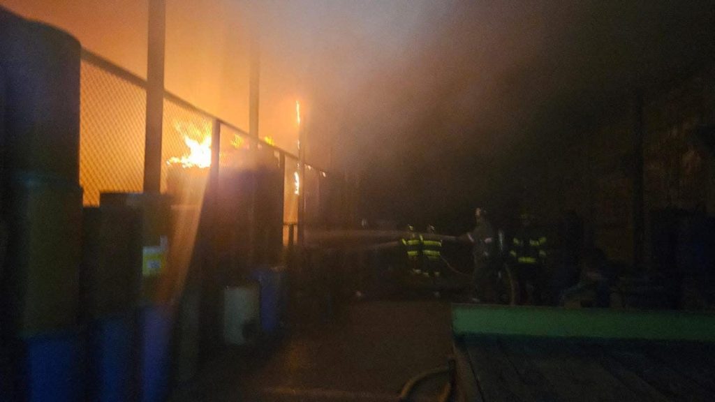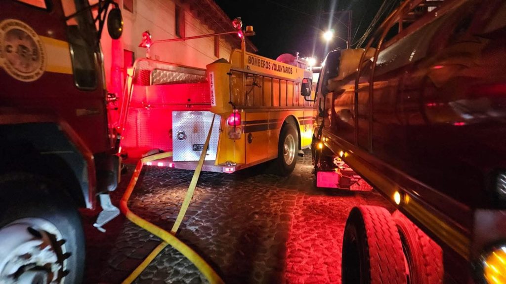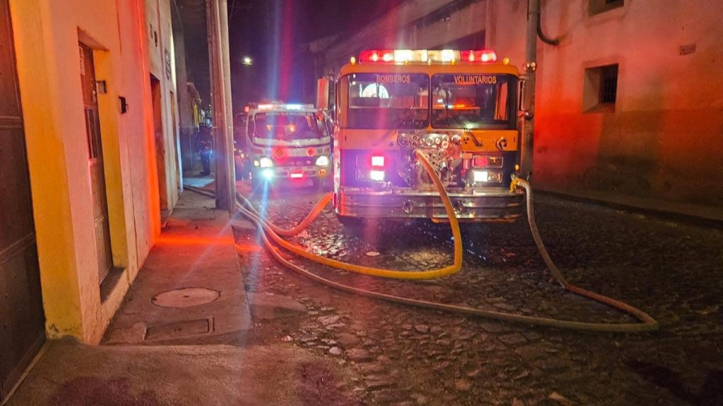 La 8va. Compañía de los Bomberos Voluntarios, trabajan en extinguir esta madrugada un incendio declarado, en tiñeria de cuero, ubicada sobre la 1ra. Avenida del Chajón en La Antigua Guatemala.