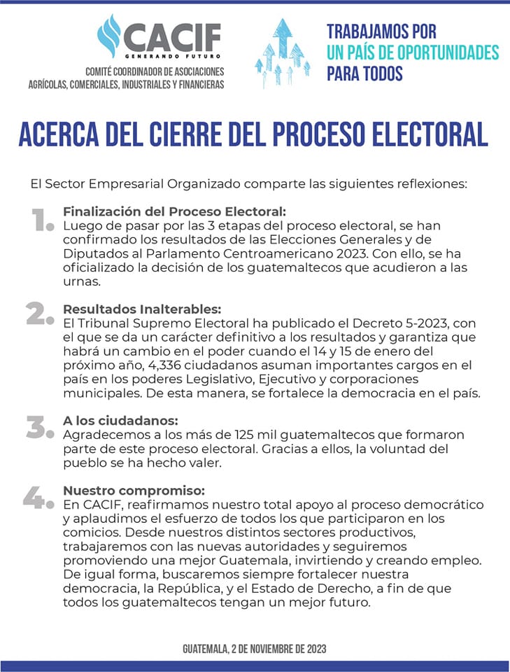 “Respetamos los resultados dados a conocer por el Tribunal Supremo Electoral, reafirmamos nuestro apoyo al proceso democrático y trabajaremos con las nuevas autoridades promoviendo una mejor Guatemala, invirtiendo y creando empleo”, expresó el Comité Coordinador de Asociaciones Agrícolas, Comerciales, Industriales y Financieras, en un comunicado.