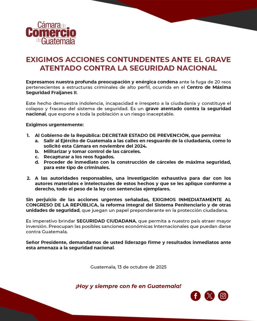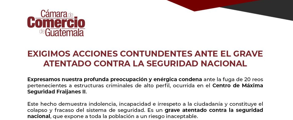 Por el peligro que representa la fuga de 20 de los más peligrosos mareros dirigentes de la pandilla 18, la Cámara de Comercio solicita al gobierno a que se decrete estado de prevención para que el ejército de Guatemala salga a las calles, militarizar y tomar el control de cárceles, recapturar a los reos que se encuentran en fuga y le exigen al Congreso de la república la reforma integral del sistema penitenciario y de otras unidades de seguridad.