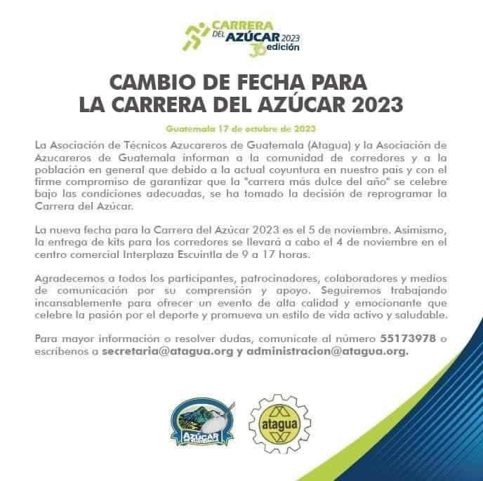 Agregando que la “nueva fecha para la Carrera del Azúcar 2023 es el 5 de noviembre. Asimismo, la entrega de kits para los corredores se llevara a cabo el 4 de noviembre en el centro comercial Interplaza Escuintla de 9 a 17 horas•”