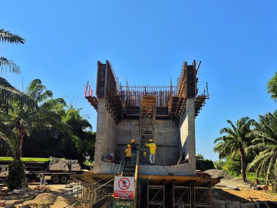 La Direccion General de Caminos del Ministerio de Comunicaciónes CIV avanza en la construcción del puente vehicular en Ocós, San Marcos, con la ejecución de la losa superior de los contrapesos en ambos lados del puente y el prearmado de los carros de avance, labores clave para asegurar una estructura sólida y confiable.
