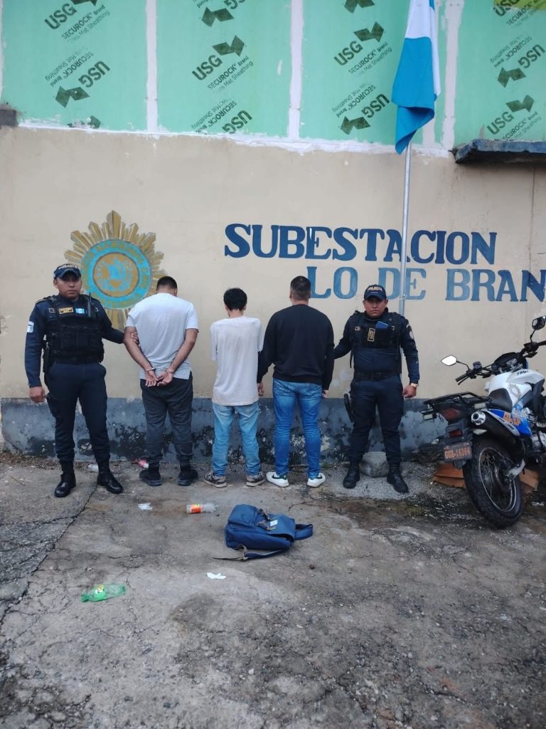 Agentes de la Policía Nacional Civil PNC de la comisaría 16 capturaron en flagrancia a tres presuntos asaltantes cuando despojaban de sus pertenencias a dos estudiantes de diversificado en la colonia La Carolingia, zona 6 de Mixco; estos fueron identificados como Pablo Samuel Dubón Vela, de 27 años; Melvin Geovanny Urizar Bolaños, de 23; y Justin Kevan Trejo Juárez, de 21.