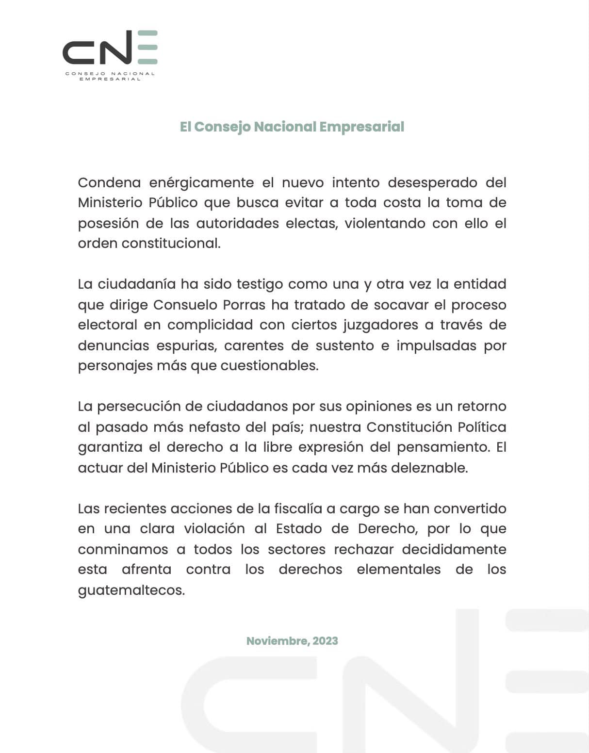 En un comunicado los empresarios aglutinados en el CNE condenan enérgicamente el nuevo “intento desesperado del Ministerio Público que busca evitar a toda costa la toma de posesión de las autoridades electas, violentando con ello el orden constitucional”