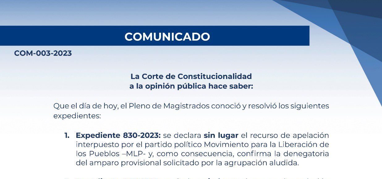 Lo anterior lo dieron a conocer en un comunicado en el que expresan que se declara sin lugar el recurso de apelación interpuesto por el partido Movimiento para la Liberación de los Pueblos MLP y como consecuencia confirman la denegación del amparo provisional solicitado por la agrupación aludida.