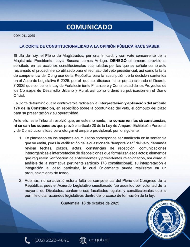 Los magistrados de la Corte de Constitucionalidad, CC, con el voto concurrente de la magistrada presidente Leyla Lemus, deniegan el amparo presentado ante este tribunal, dejando viable el dinero para la piñata que el próximo año diputados y alcaldes podrán reventar para iniciar el año preelectoral, dejando abierta una gran puerta a la corrupción con el aval de esta corte.