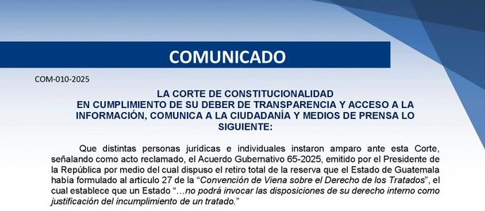La Corte de Constitucionalidad (CC) le dice no al presidente Bernardo Arévalo y a su acuerdo gubernativo 65-2025 mediante el cual disponía el retiro total de la reserva que el Estado de Guatemala había formulado al artículo 27 de la Convención de Viena sobre el Derecho de los Tratados.
