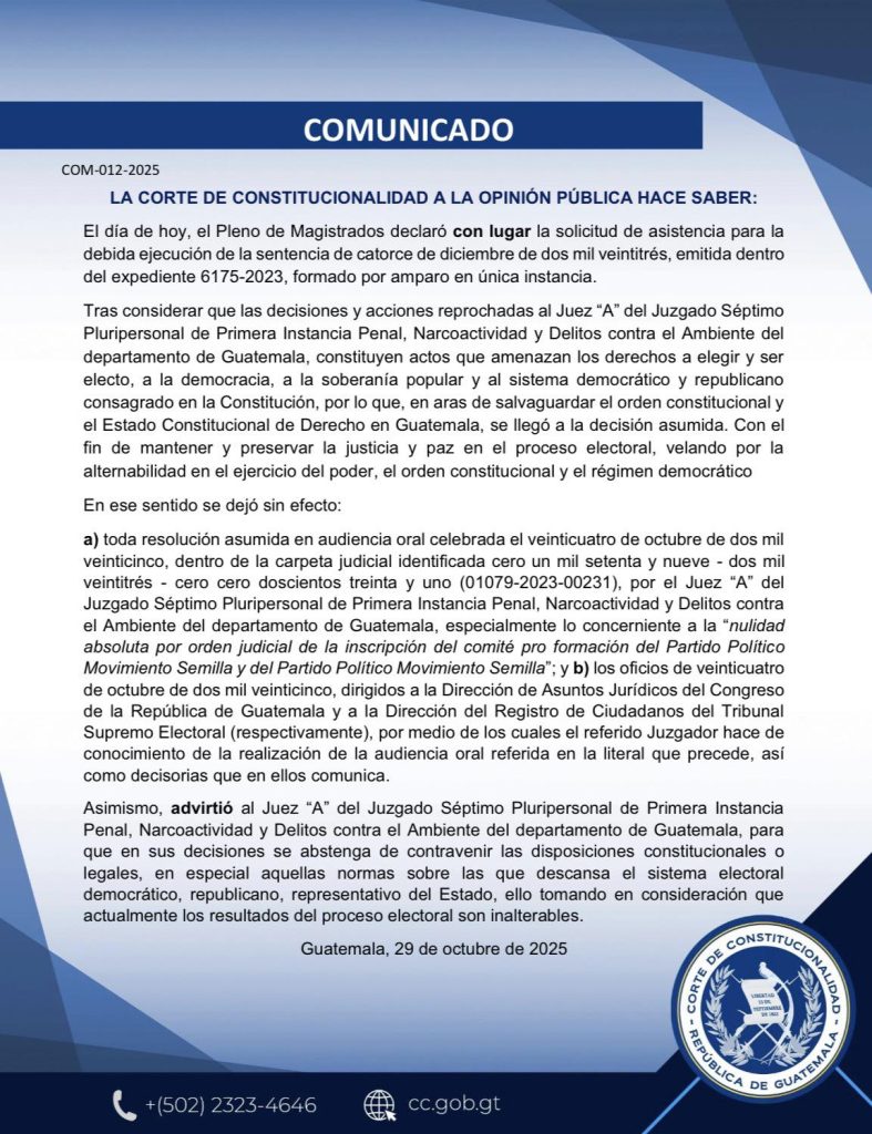 La Corte de Constitucionalidad, CC, puso en lugar al juez Fredy Orellana y dejó sin efecto la “nulidad” inventada por el juez Fredy Orellana contra Semilla. Confirmó que actuó sin competencia, violando la Constitución y amenazando la democracia y la voluntad popular, advirtiéndole a no volver a contradecir el orden constitucional.
