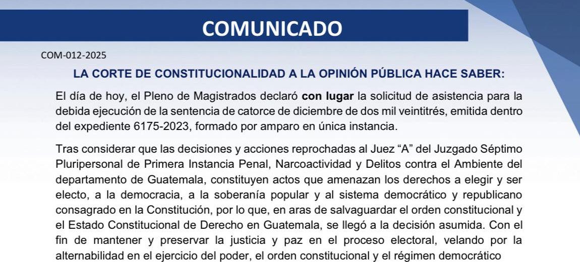 En un comunicado, la CC, indica que tras considerar que las decisiones y acciones reprochadas al juez Fredy Orellana, constituyen actos que amenazan los derechos a elegir y ser electo, a la democracia, a la soberanía popular y al sistema democrático y republicano consagrado en la Constitución, por lo que, en aras de salvaguardar el orden constitucional y el Estado de Constitucional de Derecho en Guatemala, “se llegó a la decisión asumida. Con el fin de mantener y preservar la justicia y paz en el proceso electoral, velando por la alternabilidad en el ejercicio del poder, el orden constitucional y el régimen democrático.