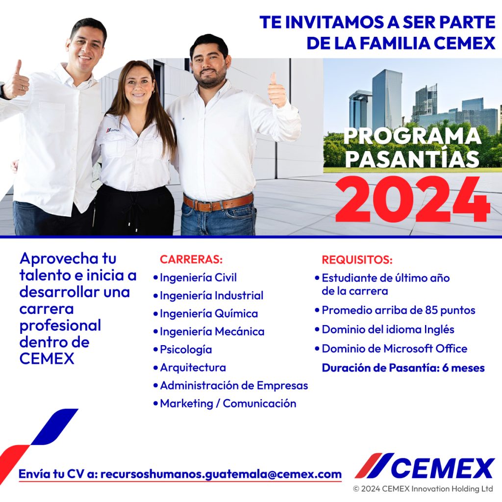 CEMEX Guatemala, líder en la industria de la construcción, se complace en anunciar la apertura de la Convocatoria de Pasantías 2024, una iniciativa que ha sido un pilar fundamental en el desarrollo de talento y la construcción de futuros profesionales exitosos.