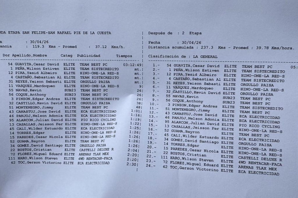 La clasificación general queda de la siguiente manera en la segunda etapa, Cesar Guavita, del Team Best PV del Ecuador, como en primer lugar y líder de la vuelta, segundo lugar para Wilson Peña del Sistecrédito y el tercer lugar para Yesid Pira, del Hino One la Red Suzuki quien entró entre los primeros de esta segunda etapa.