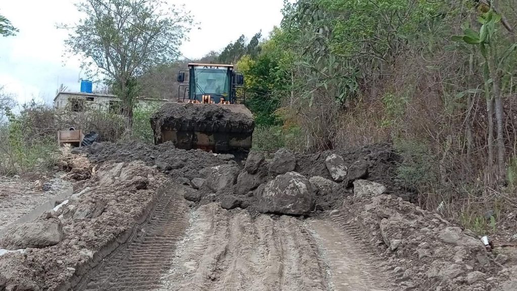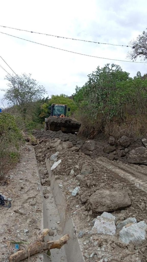 La Dirección General de Caminos, a través del personal de la Zona Vial 13 en Quiché, atiende por segundo día la obstrucción en la RN-7W, km 299.1, provocada por la crecida de una quebrada.