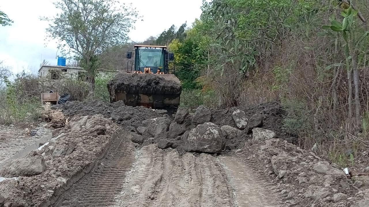 Con apoyo de un cargador frontal y un camión de estacas, se realizan trabajos de limpieza para restablecer el paso entre Sacapulas y el límite departamental con Huehuetenango.