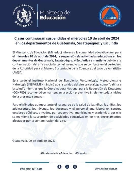 El Mineduc tomó la decisión tomando en cuenta la recomendación de la Coordinadora Nacional para la Reducción de Desastres (Conred) sobre los avances de combate de las llamas y el boletín informativo generado por el Instituto Nacional de Sismología, Vulcanologia, Meteorologia e Hidrología (Insivumeh) sobre la calidad del aire. El Insivumeh advirtió que la calidad del aire se cataloga como dañina a la salud, este tema ha generado preocupación en los últimos días debido a las posibles repercusiones para la salud, especialmente por el deterioro que podrían sufrir los más vulnerables, como niños y adultos mayores.
