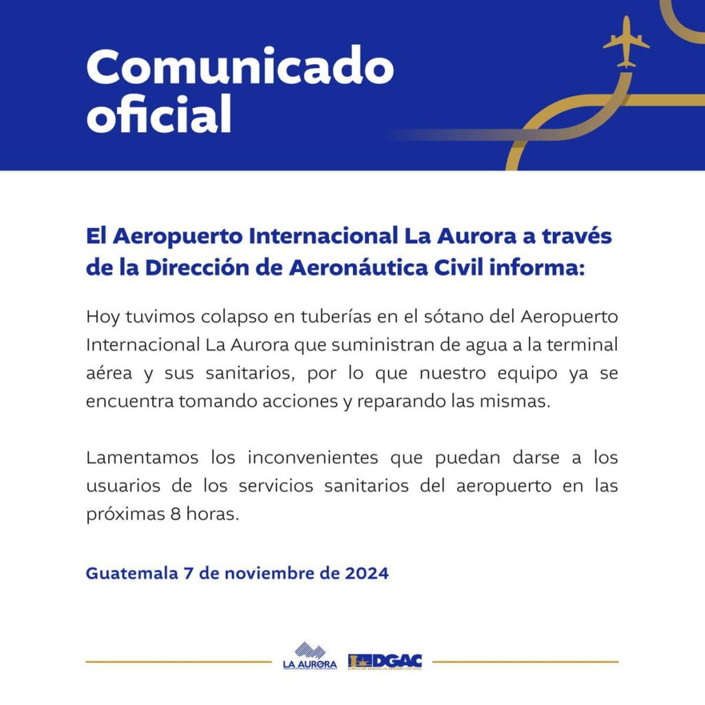 “Hoy tuvimos colapso en tuberías en el sótano del Aeropuerto Internacional La Aurora que suministran de agua a la terminal aérea y sus sanitarios, por lo que nuestro equipo ya se encuentra tomando acciones y reparando las mismas” anunció esta mañana la Dirección General de aeronáutica Civil