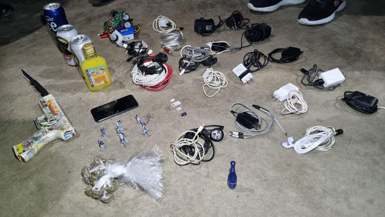 Esta mañana, agentes de la Policía Nacional Civil PNC y de la Dirección General del Sistema Penitenciario realizaron una requisa en la cárcel El Boquerón, Santa Rosa, donde decomisaron un celular, 11 cargadores para teléfono, una replica de pistola, un cuchillo, dos tarjetas sim, apuntes con números telefónicos de posibles víctimas de extorsión, siete “colmillos” vacíos, 21 bolsas con marihuana, una pipa y licor.