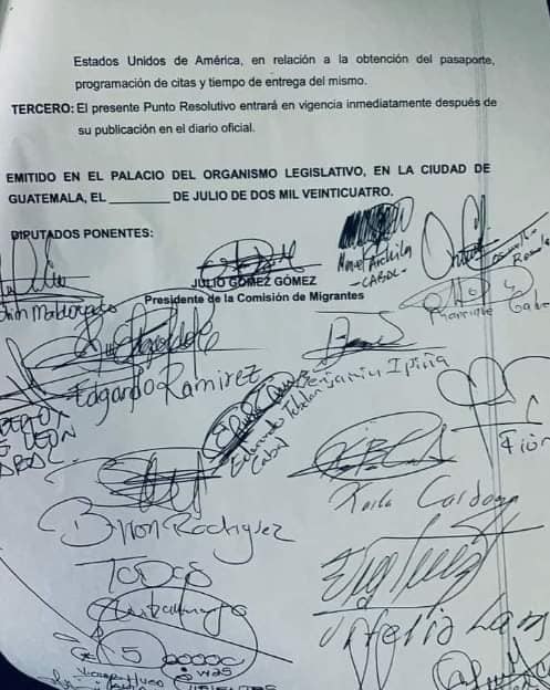 Asimismo exhorta que la cancillería guatemalteca, realice las acciones pertinentes, para mejorar la atención a los guatemaltecos en los consulados de Estados Unidos, el sistema de citas y agilizar la entrega de pasaportes guatemaltecos.