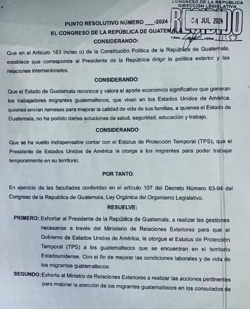 El Pleno del Congreso de la República aprobó el Punto Resolutivo 14-2024, que exhorta al Presidente de la República Bernardo Arévalo a realizar las gestiones necesarias a través del Ministerio de Relaciones Exteriores para que el Gobierno de EE.UU. otorgue el Estatus de Protección Temporal -TPS- a los guatemaltecos que se encuentran en su territorio.