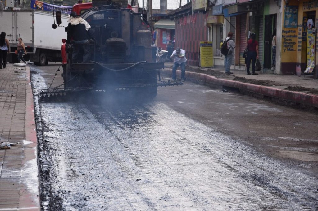 Personal de COVIAL se encuentra colocando el material de imprimación en la 2ª avenida, zona 1, esto previo a colocar el asfalto