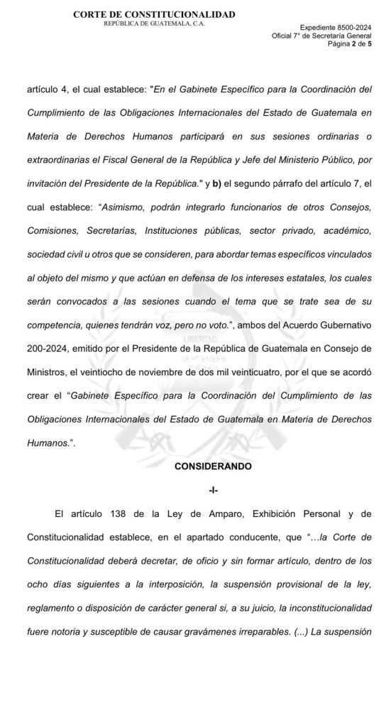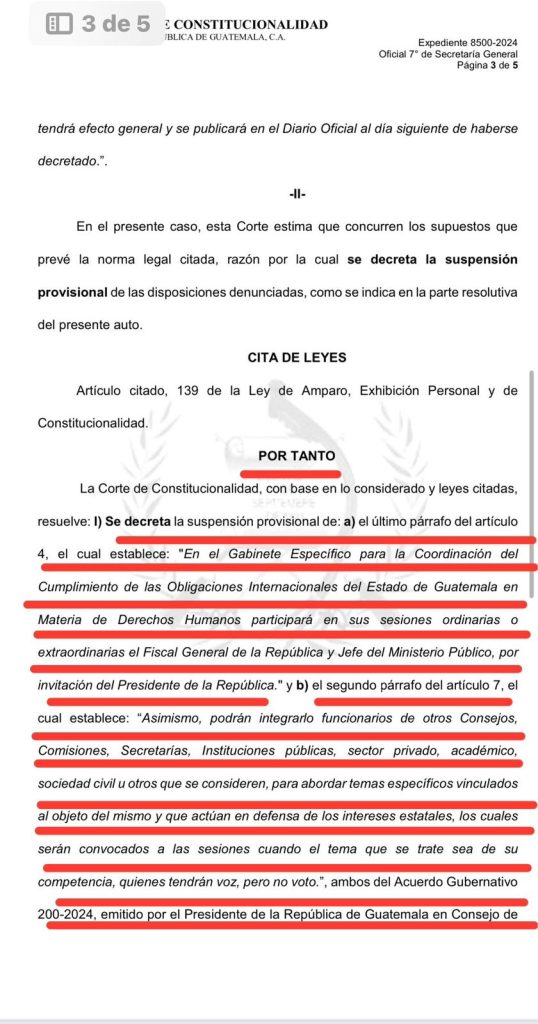 El dictamen de la CC deja sin efecto, en forma temporal, el último párrafo del artículo 4 que indica: «En el Gabinete Específico para la Coordinación del Cumplimiento de las Obligaciones Internacionales del Estado de Guatemala en Materia de Derechos Humanos participará en sus sesiones ordinarias o extraordinarias el Fiscal General de la República y Jefe del Ministerio Público, por invitación del Presidente de la República.