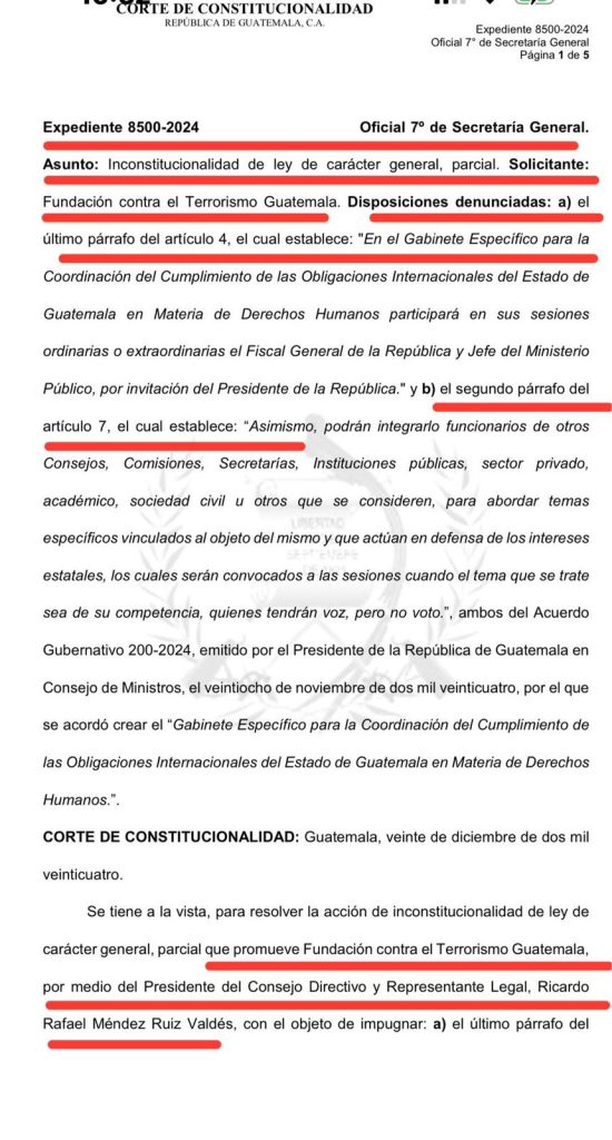 A petición de la Fundación Contra el Terror, los magistrados de la Corte de Constitucionalidad, CC, protegen a la fiscal general Consuelo Porras para que ella no asista a las reuniones del Ejecutivo donde se abordarían temas de derechos humanos según el acuerdo 200-2024 cosa que no les preocupa según lo expresara el secretario general de la presidencia, Juan Gerardo Guerrero quien cuestionó la decisión del alto tribunal.