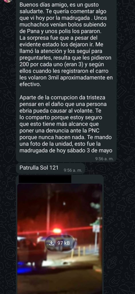 Se ha recibido una denuncia ciudadana la cuál da cuenta de que, elementos de la Policía Nacional Civil PNC quienes se conducían en la unidad SOL-121, quiénes habrían recibido soborno e incluso, las víctimas aseguran que se llevaron Q3500, de la guantera del vehículo.