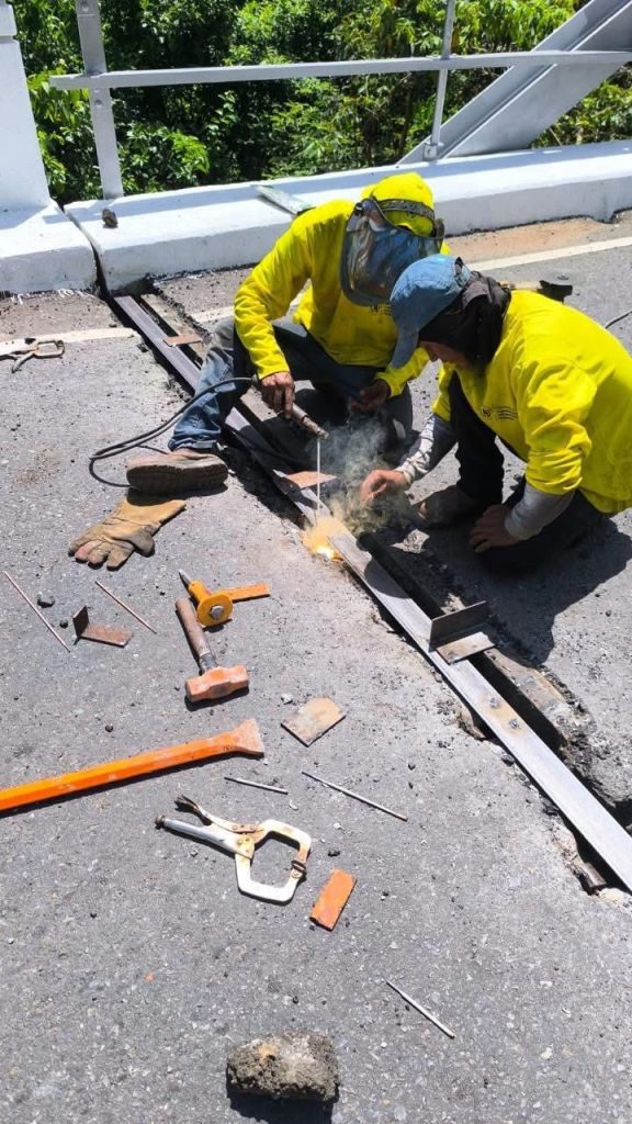 Además, se está llevando a cabo la reparación y mantenimiento de los remates del puente, abarcando tanto sus apoyos como las transiciones entre la superestructura e infraestructura. Estas acciones incluyen la inspección de las placas de apoyo, anclajes y dispositivos de conexión entre el tablero y las estribaciones, asegurando su estabilidad y correcta transferencia de cargas.