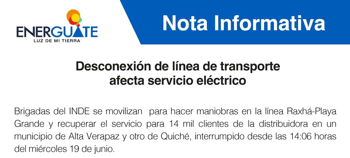 Esta situación inesperada, ajena a ENERGUATE, tiene suspendido el suministro de energía eléctrica en Salacuin, Cobán, Alta Verapaz, así como en Mayalán, Ingenieros, Los Ángeles y San Lucas, Ixcán, Quiché. Una suspensión similar se produjo el pasado 16 de junio.