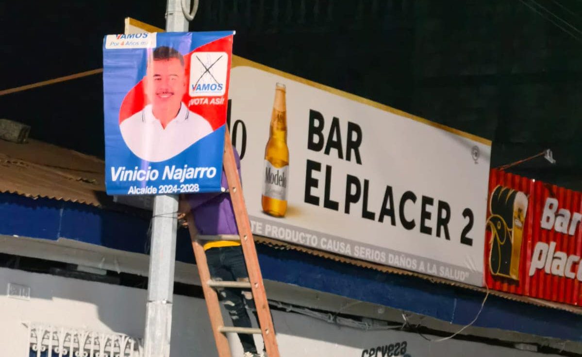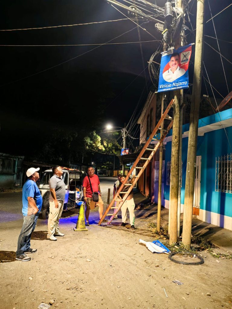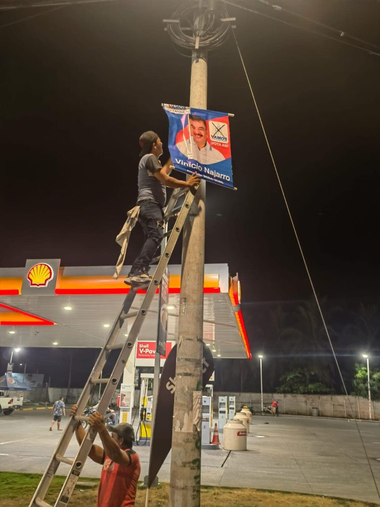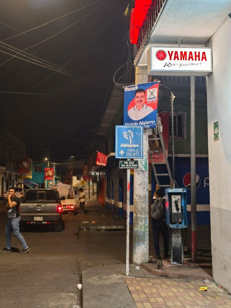 PUERTO DE SAN JOSE…Desde la media noche de este domingo y la madrugada de hoy lunes simpatizantes del Partido VAMOS comenzaron a colocar propaganda pidiendo el voto para el candidato a alcalde por el puerto de San José Vinicio Najarro, en las elecciones del domingo 25 de junio, al haberse entrado en la etapa de la campaña electoral.