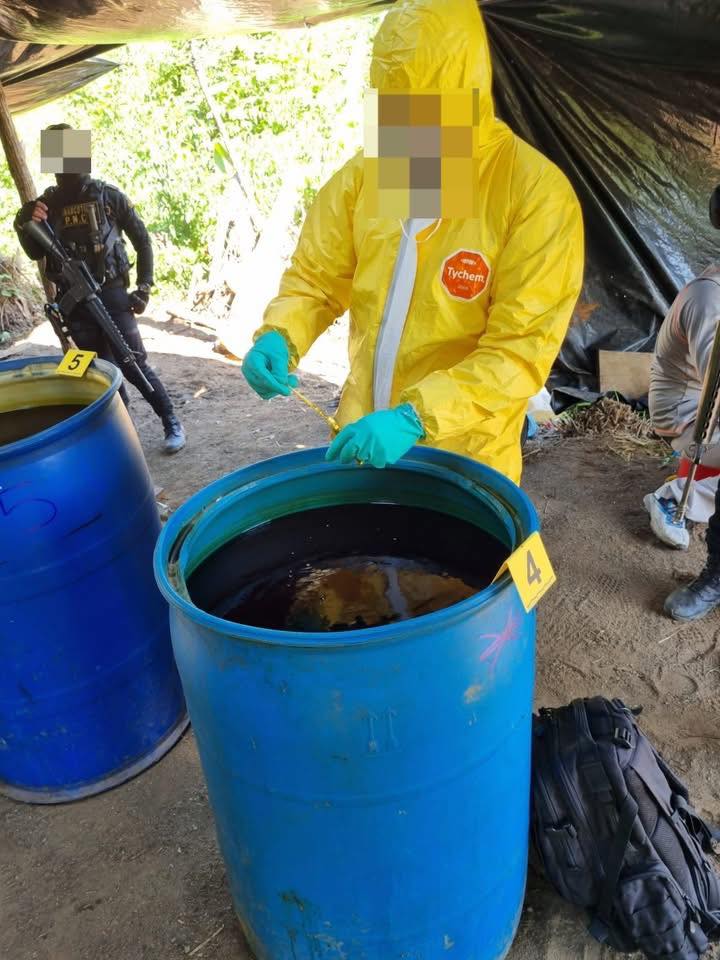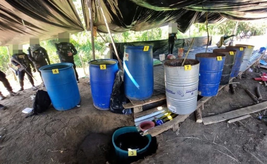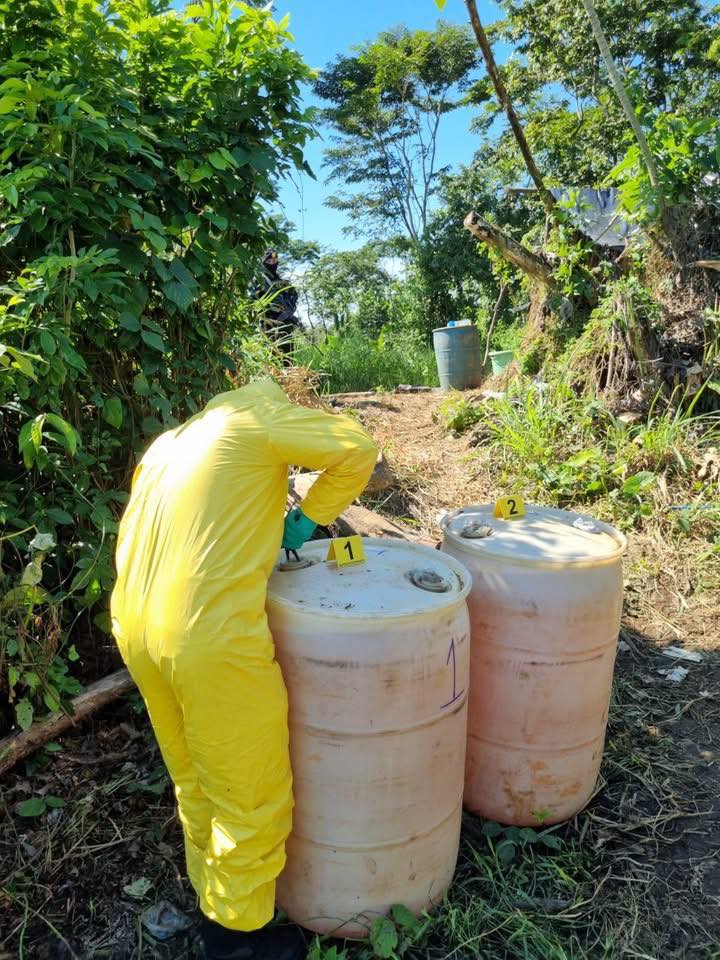 En el lugar se localizaron 6 toneles con hoja de coca, triturada, 6 toneles con gasolina, 3 sacos de sulfato de amoniaco, 2 sacos de cal y una máquina trituradora.