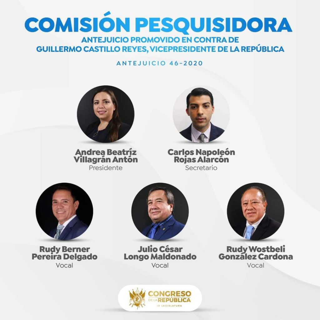 Esto podría suceder tomando en cuenta que los otros integrantes de la comisión son: Carlos Napoleón Rojas, (VAMOS) Secretario; Julio Pereira Delgado, Vocal I (FCN); Juio Cesar Longo Maldonado, Vocal II (Antes FCN ahora Elefante, aunque no sea electo, es el secretario de dicha organización); Rudy Bosbeli González Cardona, Vocal III, de ex VIVA. Otro dato importante es que solo la diputada Villagrán y Napoleón Rojas, presidenta y secretario de esa pesquisidora contra Castillo Reyes, fueron electos para la X Legislatura.