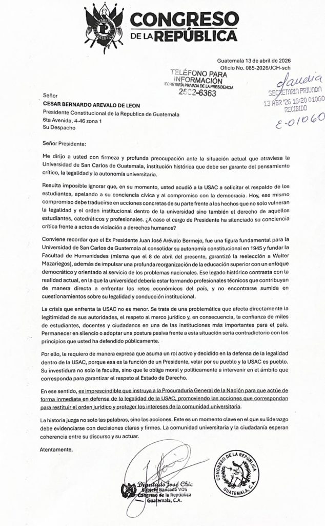 “La crisis que enfrenta la USAC no es menor. Se trata de una problemática que afecta directamente la legitimidad de sus autoridades, el respeto al marco jurídico y, en consecuencia, la confianza de miles de estudiantes, docentes y ciudadanos en una de las instituciones más importantes para el país” expresa la carta del diputado Chic