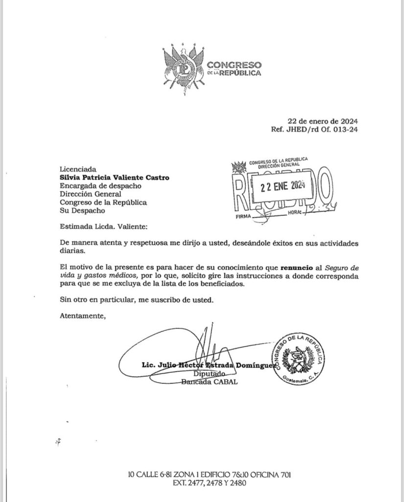 El diputado de la Bancada CABAL Julio Héctor Estrada renunció este martes al seguro médico que les brinda a todos los diputados el Congreso según una nota que envió a Silvia Patricia Valiente Castro de la Dirección General Congreso de la República
